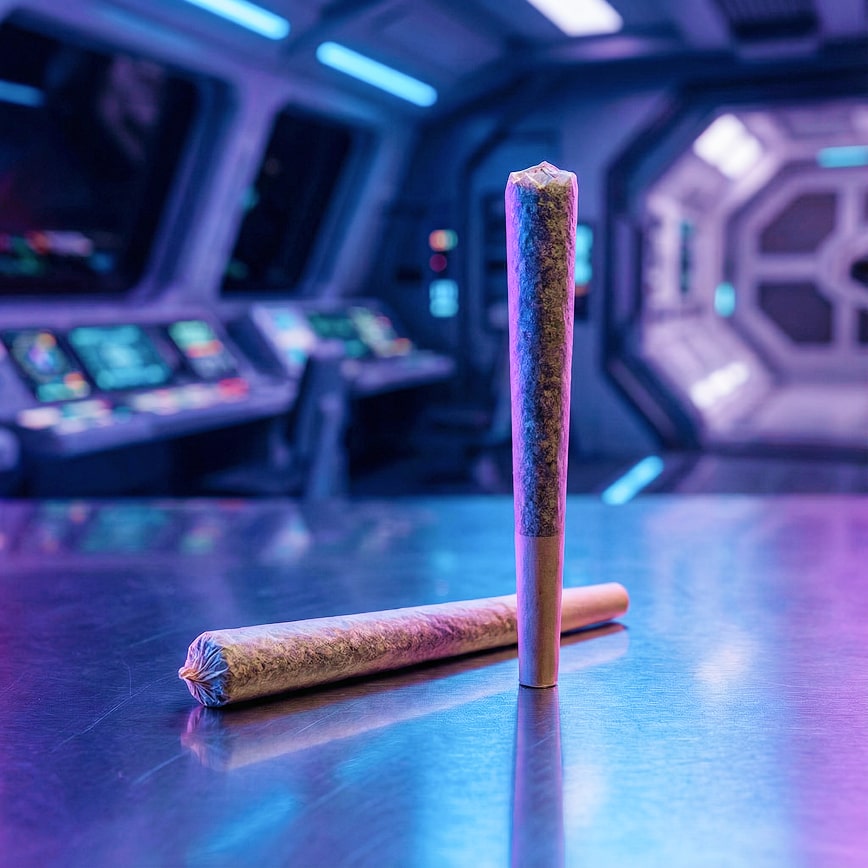 Flash Frozen Cured flower, pre-ground and rolled for convenience. Less moisture means a smoother hit with less coughing. Because of the reduced water weight, a half-gram Space Cone looks like a full gram joint from other brands. More flower, same size.
